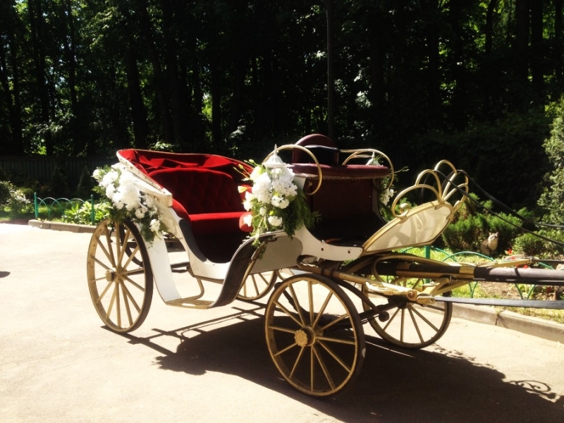 Действующая или декоративная карета. Действующая — это экипаж с рессорами, на нем можно ездить. Но иногда карету выбирают только для красивых фото молодоженов и гостей и не собираются в ней кататься. В таких случаях подходит декоративная карета. Это карета без ходовой части, ее используют только для украшения и фотосессий. В лентах и цветах она выглядит поистине сказочно.