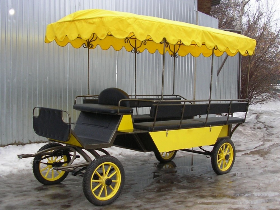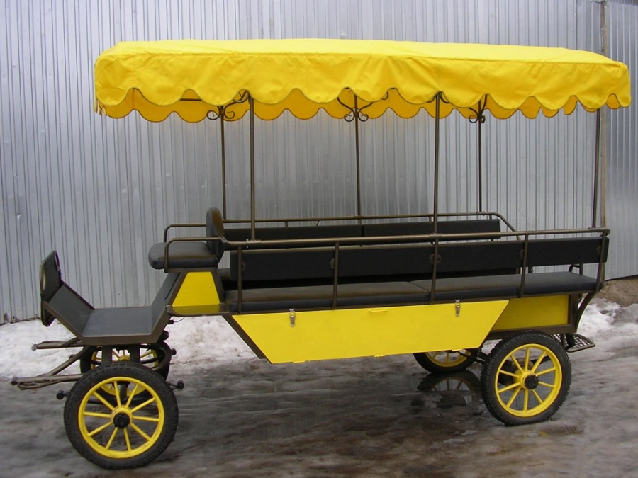 Вагонет «Турист» модель на 8-10 посадочных мест. Восемь мест в салоне и два места на облучке. Металлические части кузова покрашены порошковым антикоррозийным покрытием, стойким к истиранию и атмосферным воздействиям. Данную модель удобно использовать для свадебных экипажей, проката и летних конных прогулок.